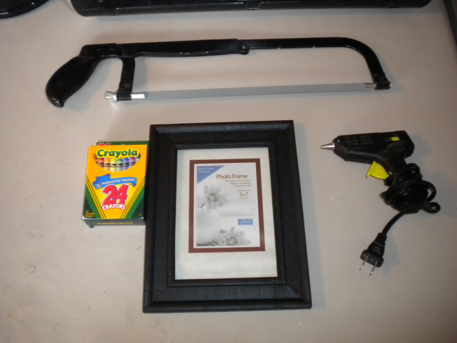 For the picture frame, you will need a picture frame, crayons (about a box and a half), hot glue and something to cut the crayons with.